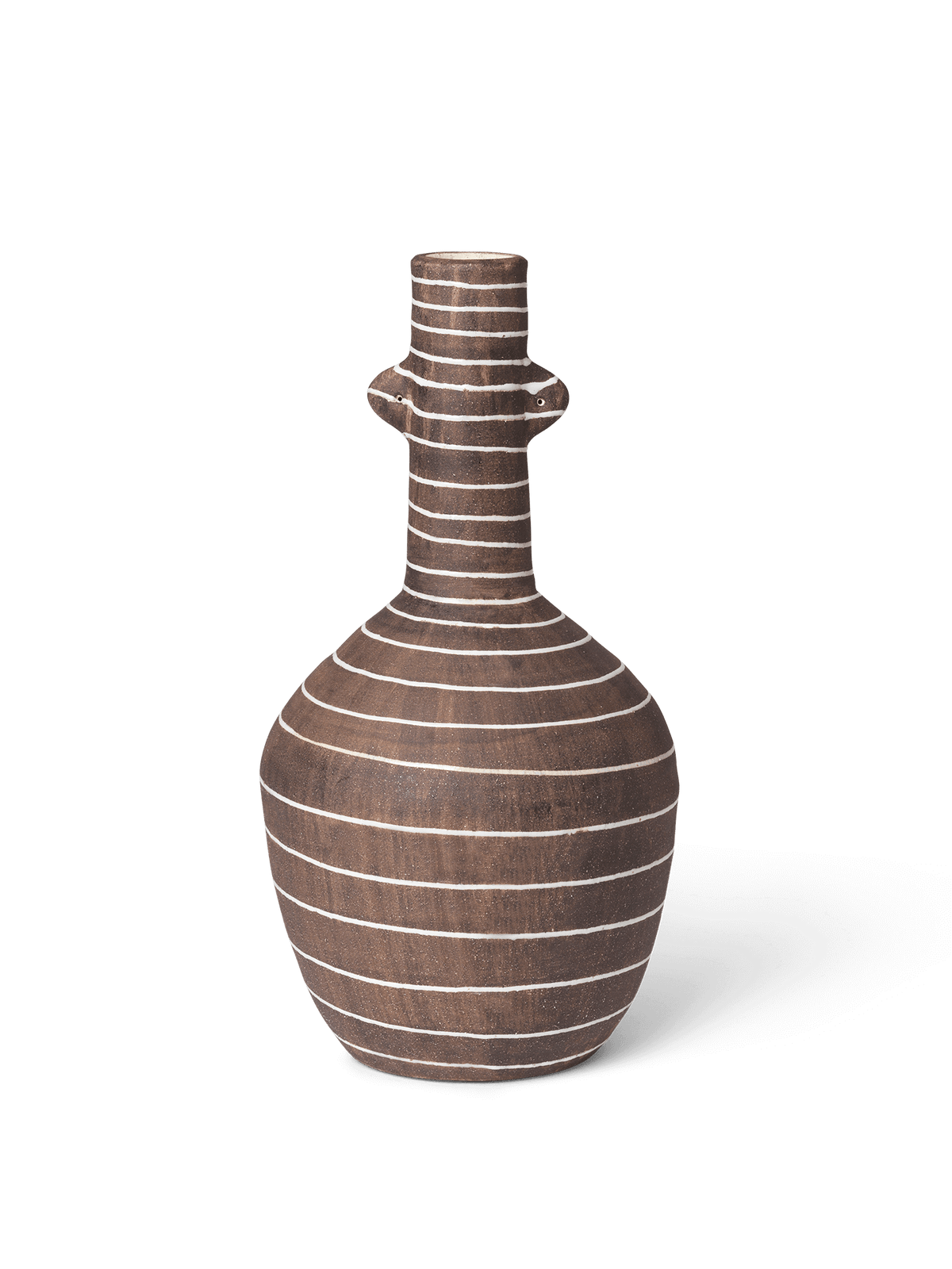 The Brura Vase is defined by its elongated neck and sleek body, adorned with bold white stripes that gracefully snake around its form. Crafted from terracotta, the piece exudes rustic elegance, enhanced by a coffee-coloured glaze that lends a sense of depth and richness. Hand-painted stripes accentuate the vase’s contours, while miniature ears on either side add whimsical personality and charm to this distinctive piece. Style it with stalks of fresh flowers or dried branches, or let it stand alone as a striking decorative element.