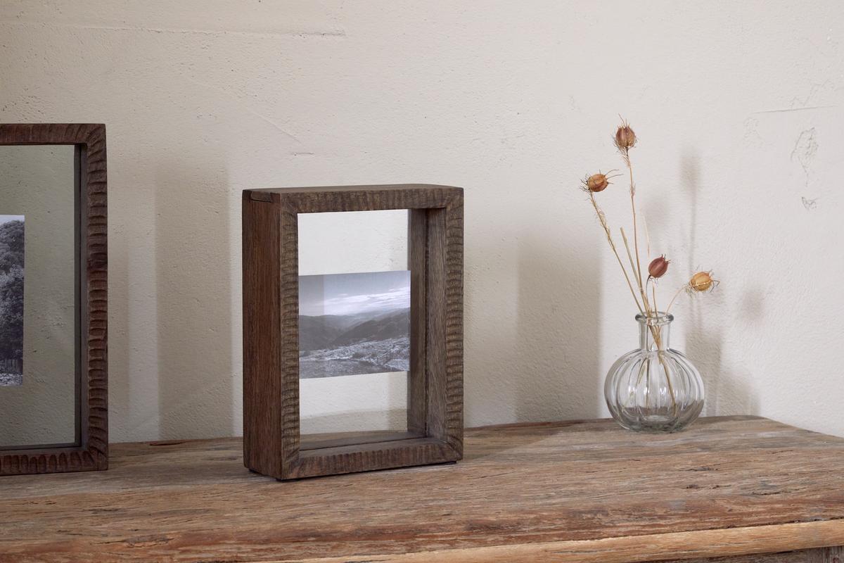 In a rich dark finish, the Indu standing frames bring a bold, modern edge to a timeless design. Crafted from sustainable mango wood, the chunky frame pairs beautifully with the clear glass to showcase photographs or artwork with understated elegance. The clever sliding glass panel on the reverse allows for easy placement and ensures your chosen piece is neatly framed. A versatile addition to shelves, desks, or mantelpieces.