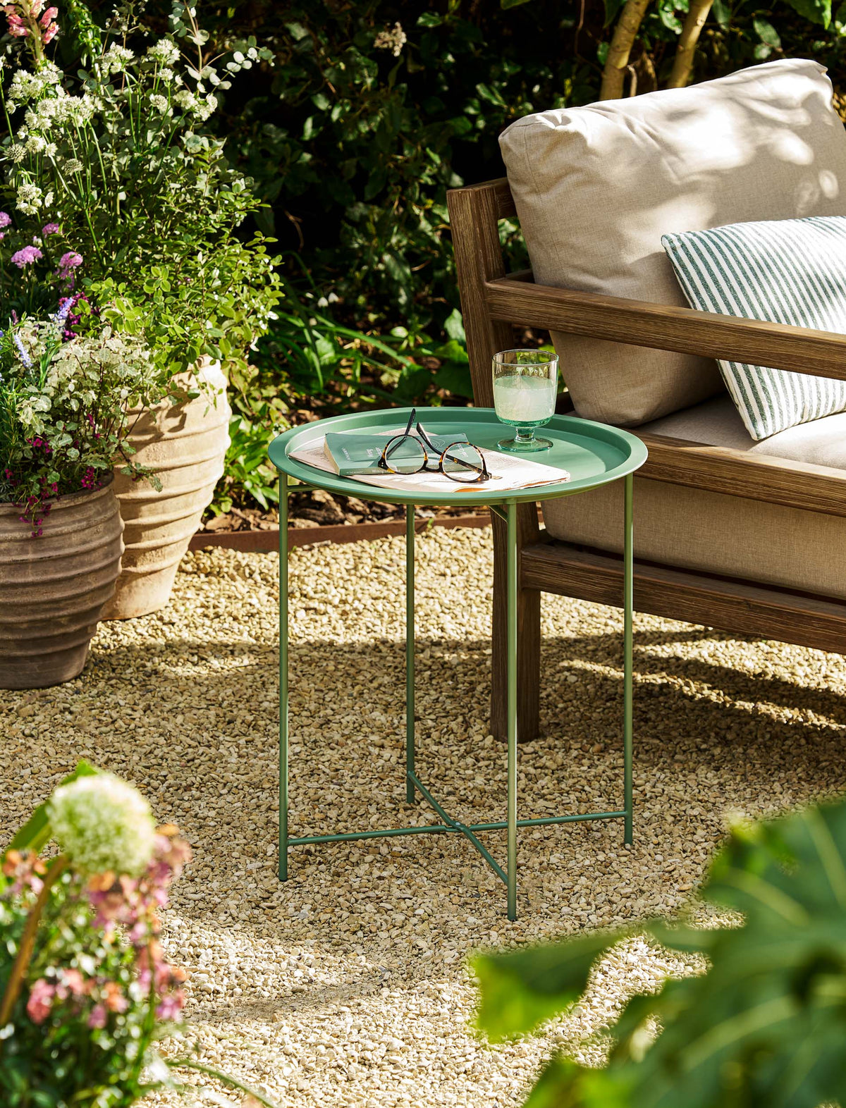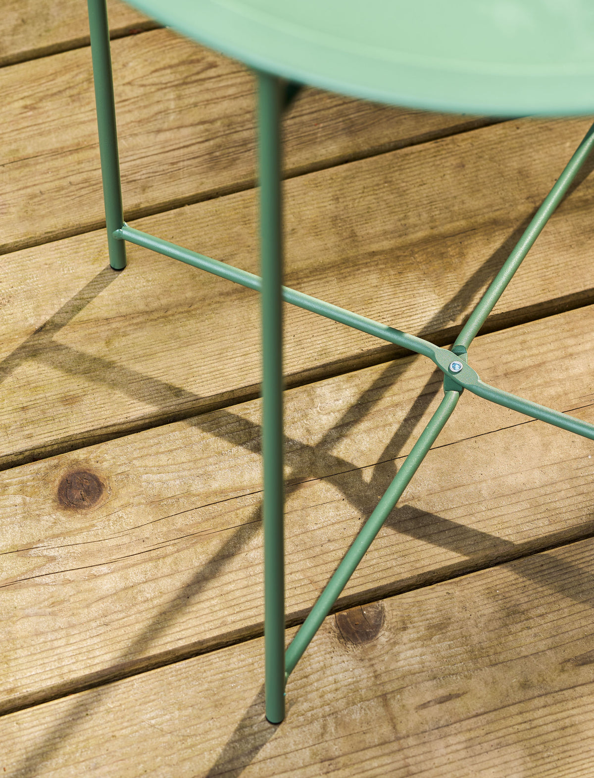 Add a bit of luxury to an outdoor living space with the Rive Droite Side Table. This cleverly designed side table has a detachable tray top that makes it easy to bring out drinks and snacks from the kitchen into a courtyard or patio space. It is a rich thistle green which works well both indoors or outdoors. Place it alongside an outdoor sofa, armchair or bench, and fold it up for easy moving and storage.